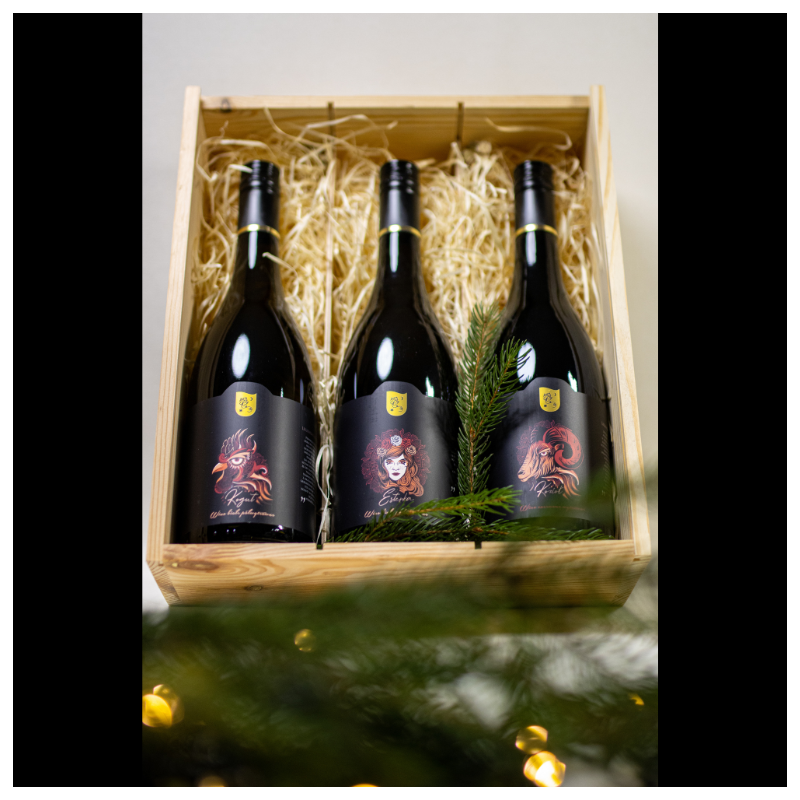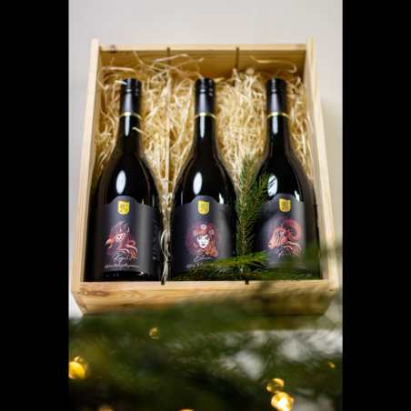 Trzy wyjątkowe wina w eleganckiej skrzynce – Kogut, Esterka i Kozioł.