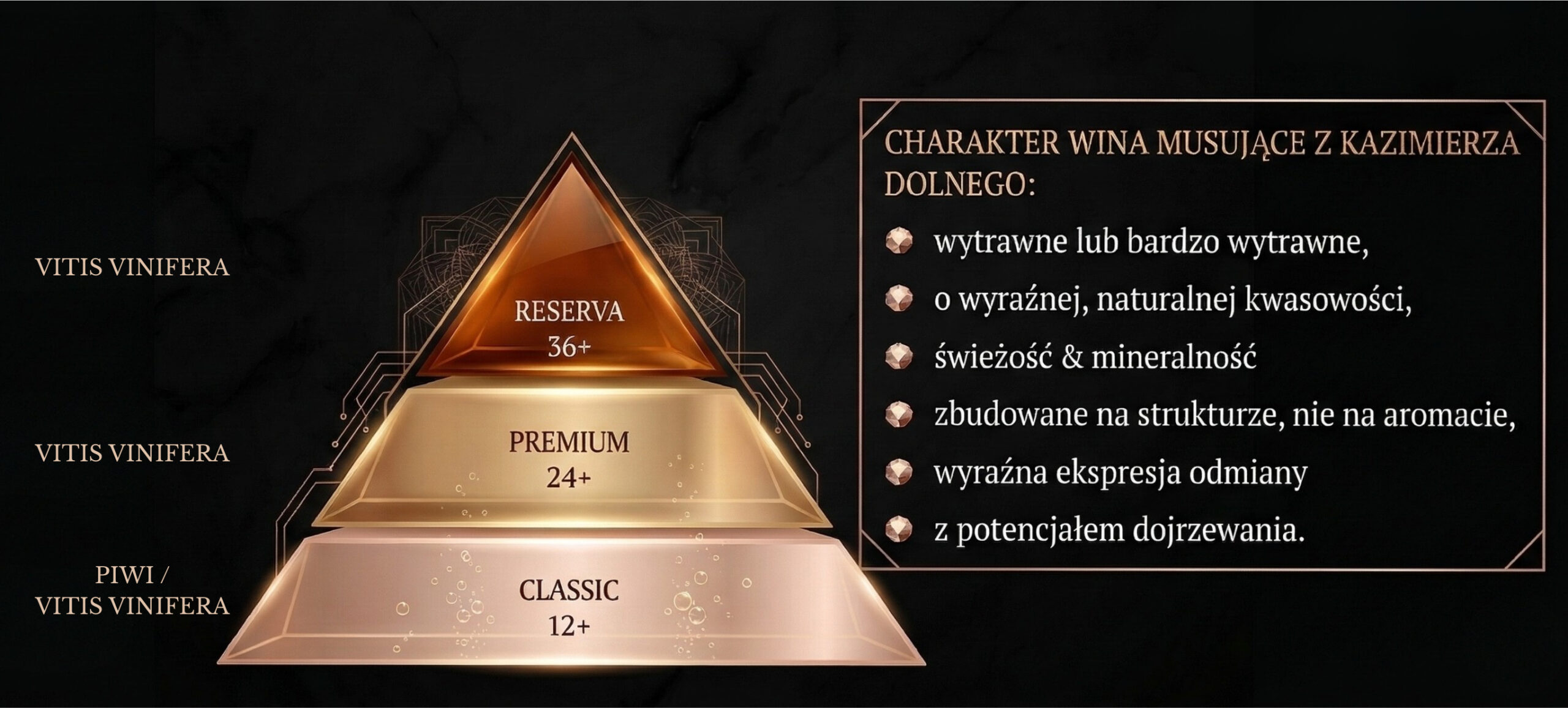 „Trójkąt jakości” porządkuje nasze wina musujące według czasu, odmiany i złożoności stylu — od win aromatycznych i świeżych, przez wina harmonijne i gastronomiczne, aż po wina o charakterze poważnym, dojrzewającym i kolekcjonerskim. W każdej kategorii zachowana jest czytelna sygnatura kazimierskiego terroir oraz wysoka precyzja technologiczna.
